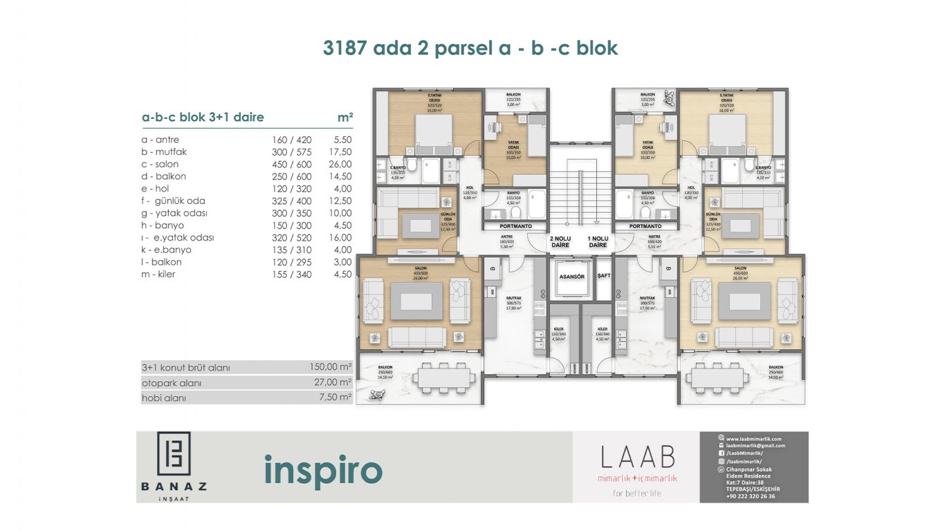 3+1 dairelerin 150 m² brüt kullanım alanına sahip geniş ve ferah planı, ailelerin ihtiyaçları düşünülerek tasarlandı. Dairelerde yer alan özel tasarım portmanto, modern ankastre mutfak ve geniş balkon gibi detaylar, yaşam alanlarına hem şıklık hem de işlevsellik kazandırıyor.