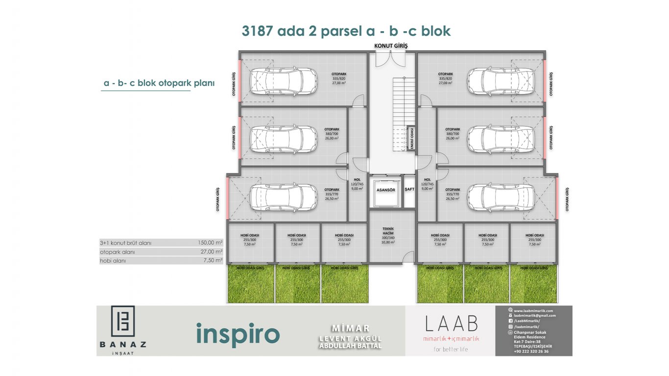 Her daireye özel kapalı otopark alanı (27 m²) ve kişisel kullanım için düşünülmüş hobi odaları (7,50 m²), projeyi ayrıcalıklı kılan önemli özellikler arasında yer alıyor. Blok girişleriyle doğrudan bağlantılı bu alanlar, hem güvenli hem de kolay erişilebilir bir kullanım sağlıyor.